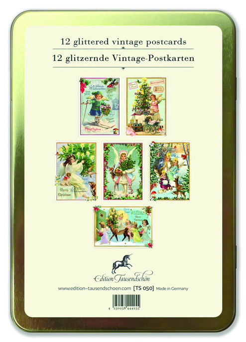 Aufklappbare, goldene Metalldose mit 12 kreativgestanzten Vintage-Glitzer-Postkarten: 6 Motive à 2 Karten
