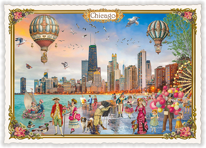 Postkarte auf festem Bilderdruckpapier mit Glimmer und gezacktem Rand Maße (B x H) in cm: 15 x 10,5